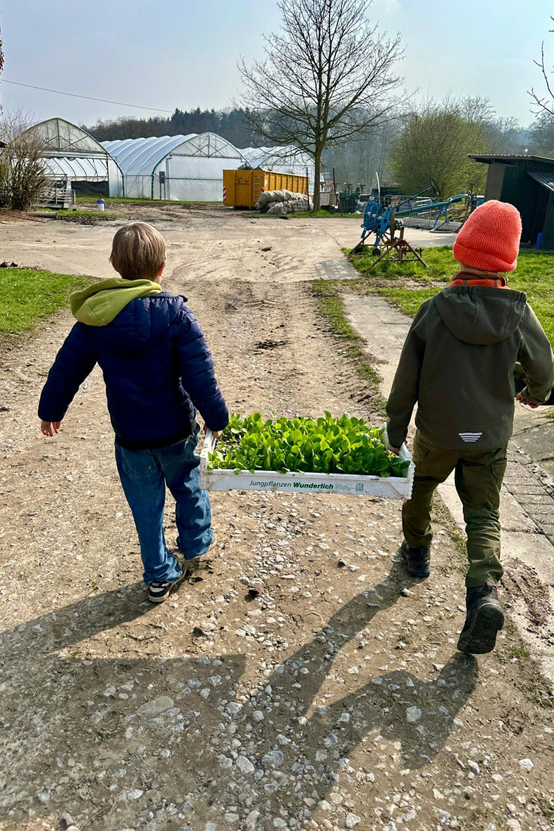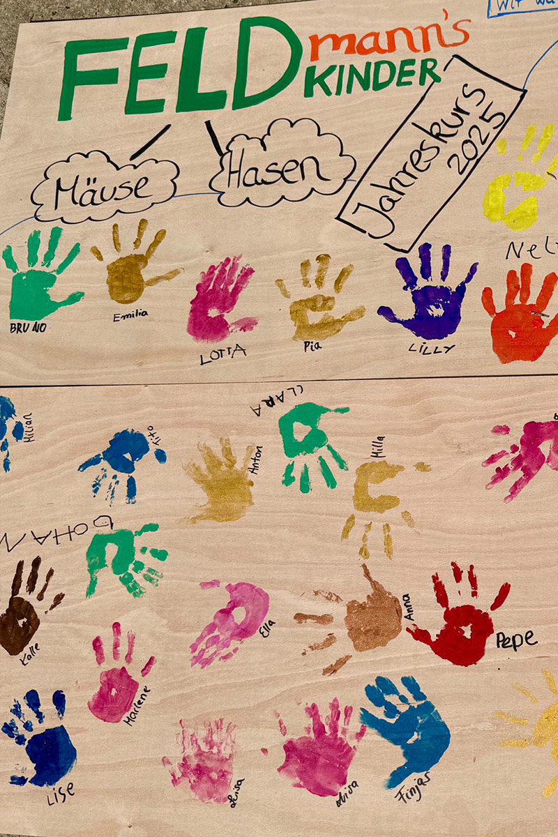 Die Arbeit auf einem Bauernhof ist natürlich sehr zeitintensiv. Wenn es unsere Zeit erlaubt, bieten wir regelmäßig Kurse und Führungen für Erwachsene, Kitas und Schulklassen an. So bleibt der Bezug zu regionalen Lebensmitteln erhalten, und Kinder lernen, woher ihre Nahrung kommt. Zudem wird das Verständnis für Landwirtschaft gefördert. Die Termine für unsere Jahreskurse „Feldmanns Feldkinder“ findet ihr zu Beginn des Jahres auf unserer Instagram-Seite und im Hofladen.